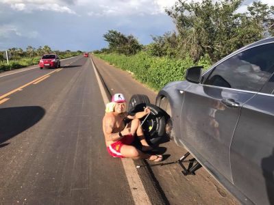 “Oh coisa boa é trocar um peneuzim 3 horas da tarde numa BR do Piauí viu? Só faltou nevar!”, escreveu Whindersson. Na imagem que completa o post, o humorista aparece com uma camisa e um boné na cabeça, sem camisa, de calção, chinelo, sentado no chão às margens da BR 343 trocando o pneu do carro.