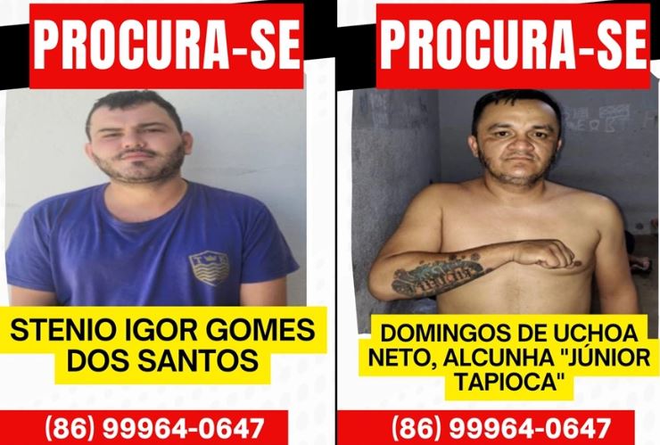 A Secretaria de Segurança Pública do Piauí divulgou fotos de dois criminosos foragidos, Stenio Igor Gomes dos Santos e Domingo de Uchoa Neto, vulgo Júnior Tapioca, alvos de uma operação do DRACO em Pedro II, Norte do estado. Ao todo, foram expedidos 13 mandados de prisão e 13 de busca e apreensão; seis pessoas foram presas, dois morreram em confronto e cinco seguem foragidos, incluindo os principais alvos.
