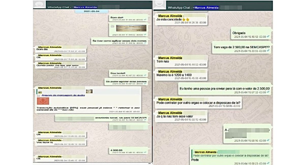 Tais registros foram obtidos pela polícia no curso das investigações, culminando nas prisões de Suelene (ex-assessora de gabinete de Doutor Pessoa), Marcus Almeida de Moura, Mauro José de Sousa e Rafael Thiago Teixeira Ferreira. Em uma troca de mensagens, Sol Pessoa instrui Marcus Almeida, então servidor terceirizado, a agilizar indicações para cargos em secretarias municipais — em uma solicitação, ela pede que um nome seja alocado na Secretaria de Cidadania com salário de R$ 4 mil.