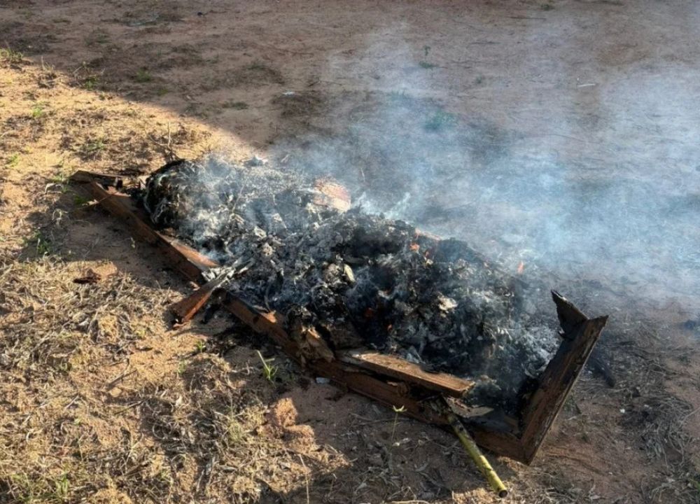 Ao chegarem ao ponto indicado, os agentes encontraram cinzas e vestígios que sugerem, de forma preliminar, tratar-se de um possível caixão. No entanto, devido à grande quantidade de fumaça e às condições do material, não foi possível confirmar, naquele momento, a presença de restos mortais.